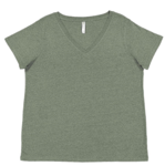 LAT Ladies' Curvy Fit V-Neck Fine Jersey Short Sleeve Tee. 4.5 ounce 60% combed ringspun cotton/40% polyester fine jersey. Heather is 90% combed ringspun cotton/10% polyester. Natural Heather is 100% combed ringspun cotton. Ribbed v-neck collar. Self-fabric back neck tape. Double needle sleeves and bottom hem. Side seam construction. EasyTear label.
